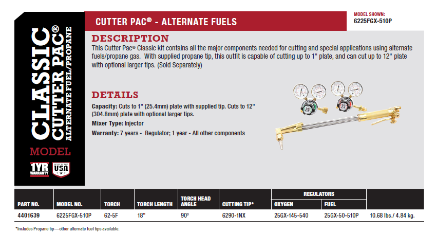 Ver Disponibilidad en tiendaEquipo de oxicorte cutter pack para butano. Capaz de cortar hasta 12" (304.8mm) de placa. Para trabajos extra pesados.