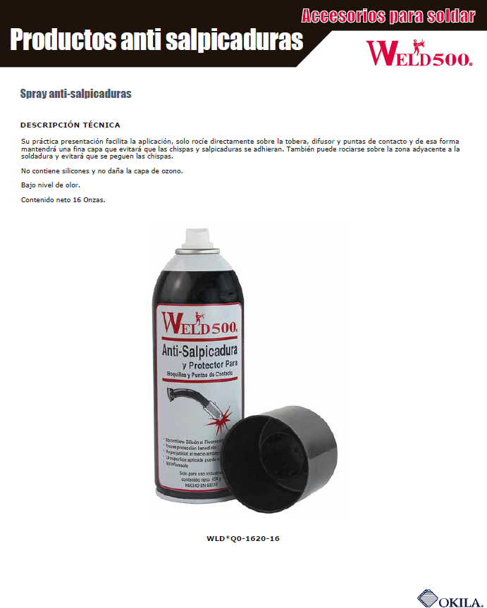 Ver Disponibilidad en tiendaSpray antisalpicadura que brinda una rica capa protectora y evita que se adhieran las chispas o salpicaduras producidas durante la soldadura.
