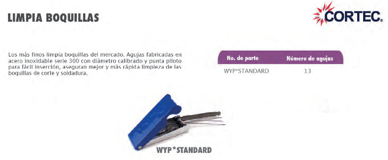 Punta piloto para fácil inserción que asegura una mejor y más rápida limpieza de las boquillas de corte y soldadura.