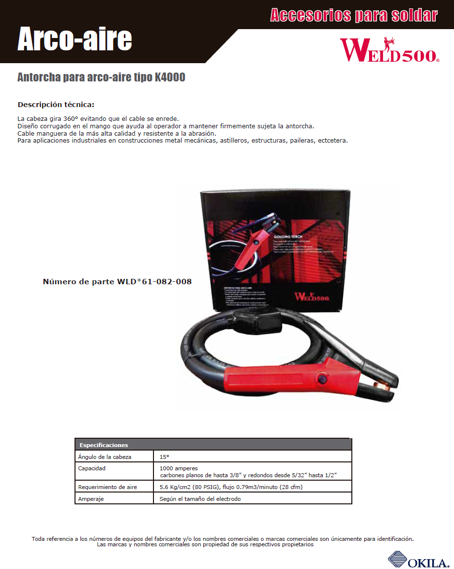Ver Disponibilidad en tiendaAntorcha K4000 para arco aire de capacidad de 1000A.