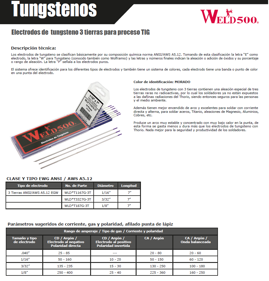 Ver Disponibilidad en tiendaTungsteno 3 tierras de 1/16", 3/32" y/o 1/8" (depende selección) para proceso TIG. Longitud de 7".