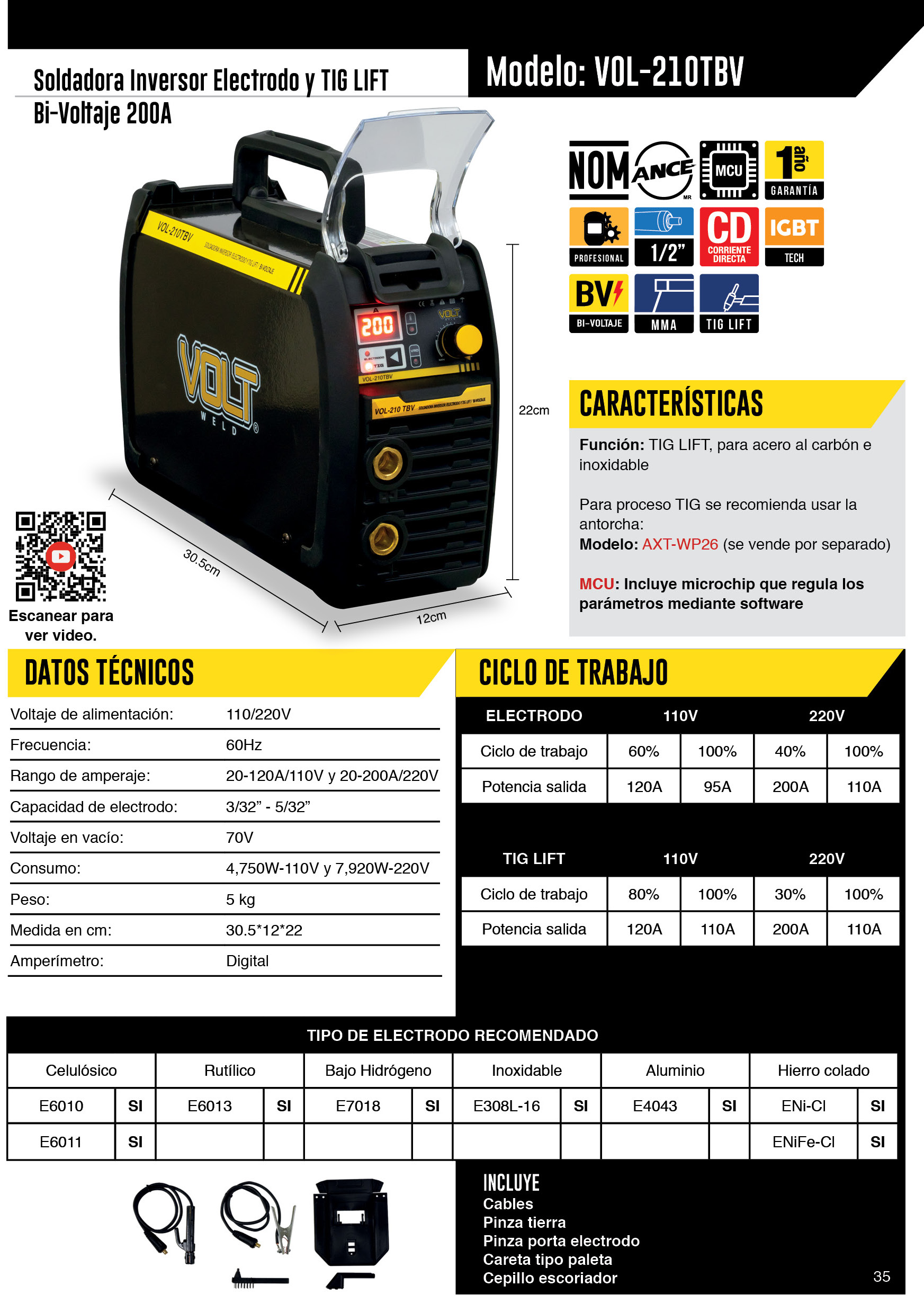 Ver Disponibilidad en tiendaLa VOL 210TBV es una soldadora inversora que puede soldar en electrodo y TIG Lift hasta 200A, bi voltaje 110/220V y con pantalla digital. Capaz de soldar electrodos 6010, 6011, 6013, 7018, inoxidable (308), aluminio (4043) y hierro colado (ENI-CI, ENIFe-CI).